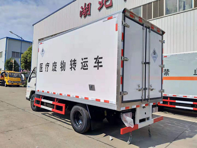 ★廂體采用國(guó)內(nèi)領(lǐng)先工藝:外玻璃鋼,內(nèi)不銹鋼,中間5cm聚氨酯填充,車(chē)廂與大梁之間采用橡膠皮廂體下方圓弧形處理,后門(mén)為雙層密閉結(jié)構(gòu),并采用迷宮式封條,使車(chē)廂完全封閉。加裝零下五度制冷機(jī)組,自動(dòng)消毒噴霧器,廂體兩側(cè)帶貨物固定卡槽,廂內(nèi)裝配紫外線消毒殺菌設(shè)備。采用表帶醫(yī)療廢棄物的標(biāo)示。