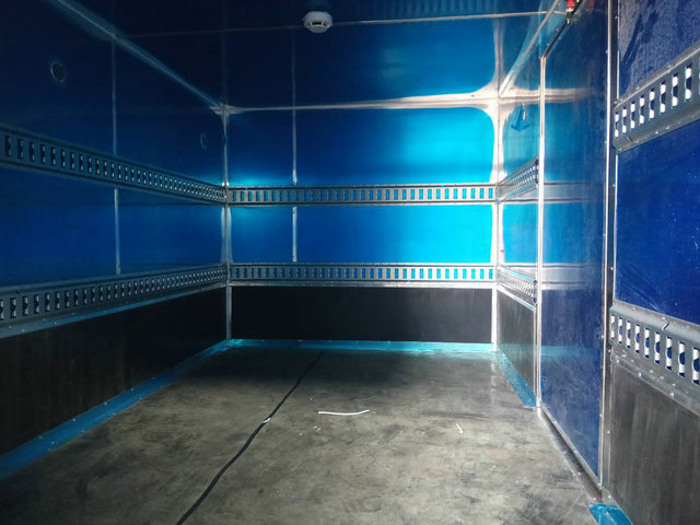 如圖我們看到的這款車,就是專用于運輸危險廢物的車輛,該車為江鈴,廂長4200X寬:1960X高:1800(MM),外表看上去,可能和普通貨車并無太多差別,就是外面有危險品標(biāo)識和禁止煙火等標(biāo)語,其實不然,首先該車的配置就是危險品必須配置:如:ABS,限速器,前碟后股,以及排氣管前置等等要求,我們看一下廂體內(nèi)部: