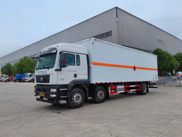 重汽汕德卡爆破器材運輸車底盤配置:廂體長寬高:9600X2400X2400(MM),核載噸位:9900(KG),用冷軋鋼板,內部采用鋁板,夾層復合阻燃材料,嚴格控制防火阻燃性,車廂內以及邊部安裝的有煙霧報警器以及固定裝置,廂體貼‘爆破器材’危險品標識。