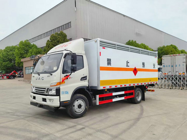 江淮V7爆破器材運輸車底盤配置:廂體長寬高:5200X2400X2000(MM),核載噸位:6550(KG),用冷軋鋼板,內(nèi)部采用鋁板,夾層復合阻燃材料,嚴格控制防火阻燃性,車廂內(nèi)以及邊部安裝的有煙霧報警器以及固定裝置,廂體貼‘爆破器材’危險品標識。