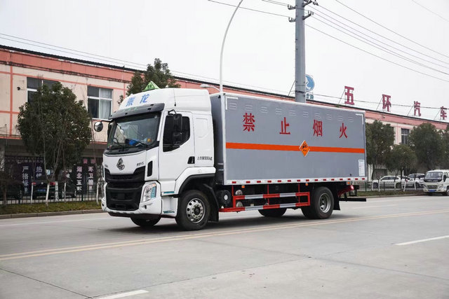 柳汽腐蝕性物品廂式運(yùn)輸車上裝配置:廂體長(zhǎng)寬高:6200X2300X2400(MM),荷載噸位:10500(KG),車輛外部采用專用冷軋鋼板,內(nèi)部采用鋁板,夾層復(fù)合阻燃材料,嚴(yán)格控制防火阻燃性,車廂內(nèi)以及邊部安裝的有煙霧報(bào)警器以及固定裝置,廂體貼‘腐蝕品’危險(xiǎn)品標(biāo)識(shí)。